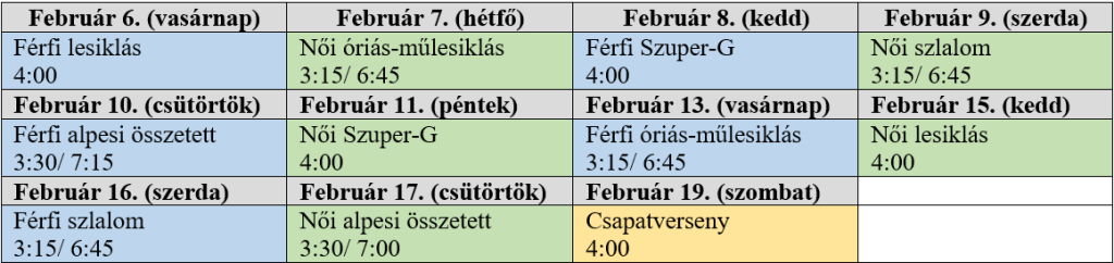 Az olimpia tervezett programja (magyar idő szerint) – Alpesi síelés: