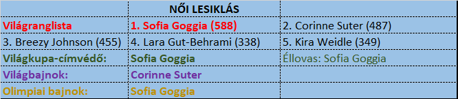 Mikaela Shiffrin: Az olimpiai címvédő, aki két nagy győzelemmel és még egy dobogóval nyitotta az idényt. Mondhatni, karácsonyig ő dominálta a szakágat. Majd jött a koronavírus, a karantén, ami némiképp elbizonytalanította. Ami esetében annyit jelent, hogy volt egy rossz versenye (7. hely) és egy elhibázott futama. Ha hozzátesszük még, hogy az előző három vb-ről egyformán éremmel távozott óriásban, vitán felül ott a helye az esélyesek között.