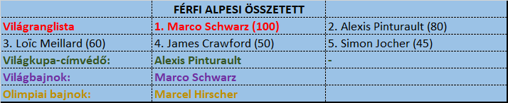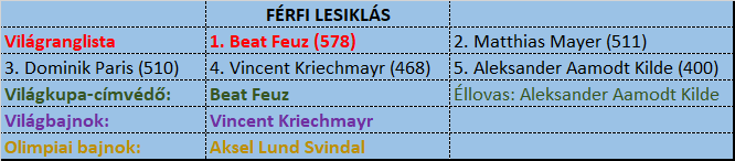 Matthias Mayer: Szocsi lesikló olimpiai bajnoka remek formában kezdte a szezont, hogy aztán a Dolomitok hullámzó pályáin látványosan elveszítse a fonalat. Az utolsó két klasszikuson mintha ismét szebbik arcát mutatta volna, de Wengenben így sem volt igazán meggyőző, hazai lejtőn pedig a valóban extrán jól sikerült Hausbergkante kivételével szintúgy nem alkotott elsöprőt. Mayer vérbeli világversenyes sportoló, a formaidőzítés nagy mestere. Ha megnyerné, a valaha volt legnagyobbak közé kerülne Ausztriában, s ezután már nem csak szülővárosában emelnének neki szobrot.