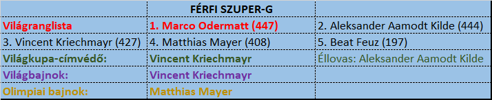 A papírforma tehát Kilde, Odermatt és az osztrák különítmény harcát vetíti elő. Előbb említett kettő világklasszis mellett az idény meglepetésembere, Raphael Haaser emelendő ki. Harmincon túli rajtszámmal kezdte a telet, hogy aztán három TOP10-helyezéssel, közte egy bormiói dobogóval utat törjön magának az olimpiai csapatba. Mellette szól, hogy tőle igazán nem vár senki kiemelkedő eredményt. A negyedik ember vélhetően Franz és Striedinger közül fog kikerülni, de nem látni bennük a bravúrt. Ugyanez a helyzet a svájciaknál. Feuz egy gyorsra fazonírozott nyomvonalon alkothat igazán maradandót, Rogentin és Gino Caviezel párosa inkább technikai oldalról közelíti ezt a szakágat. Fix TOP10-síző mindhármuk Szuper-G-ben, mégis nagy meglepetés lenne, ha érmet fognának.