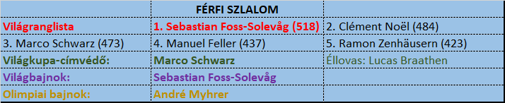 Talán soha ilyen kiegyenlített és változatos nem volt a férfi szlalomosok mezőnye, mint az idei szezonban. Bár tavaly is számos győztes váltotta egymást a világkupán, Schwarz viszonylag könnyedén hódította el a kristálygömböt, és a dobogósok is rendre ugyanabból a 7-8 fős körből kerültek ki, kiegészülve néha 1-1 meglepetéssel. Idénre borult mindez, és 6 versenyen 14 különböző síző állt dobogóra, ráadásul hat különböző győztessel! Így most kissé a sötétben tapogatunk, de az esélyeseket azért bemutatjuk.