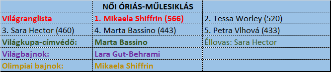 A kombináció mellett óriásban lehet a legnehézkesebben jósolni, mert még egy sor remek síző odaérhet az érmes helyekre. Petra Vlhová a maga három dobogójával és két további TOP5-ével egyértelműen ez a kategória. A kiemelkedő formában síző Hector mögötti üldözőkkel végig partiban volt, jellemzően századok, apróságok okozták a különbségeket, hol pro, hol kontra.