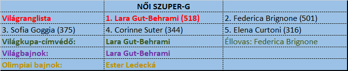 Illendő elsőként megemlíteni a címvédőt. Ester Ledecká magától értetődő módon igazolta Pjongcsang óta, hogy az a négy évvel ezelőtt csodás nap messze nem volt kifutott eredmény. A hódeszkás olimpiai kvalifikáció oltárán feláldozta a VK- idényt, Szuper-G-ben például csak három futamot teljesített a hétből. Valós aranyesélyei megint snowboardban lesznek, de az az ösztönös tehetség, ami a cseh lányban lakozik, kihozhatnak belől egy újabb rendkívüli napot.