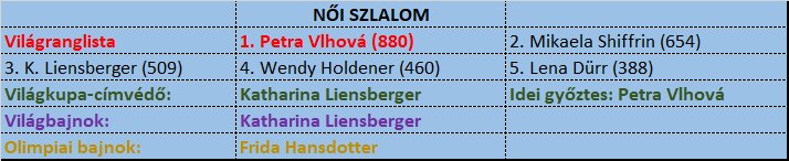 Lena Dürr: a két nagy esélyes mögött a németnek van a legtöbb dobogója a szezonban. Ugyan Levi után kissé visszaesett, de épp Schladmingban ért fel ismét a harmadik helyre. Kérdés, egy esetleges esélyes helyzetet hogy kezel majd, ugyanis a számban 11 szezonon keresztül kergette első dobogóját, mígnem ez novemberben sikerült neki. Ha viszont csak az idei eredményeket és a formát nézzük, bizony Dürrnek bőven van keresnivalója a dobogón.