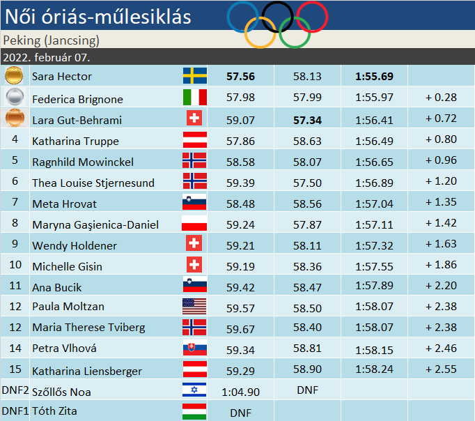 Férfias pálya, csillaghullás. A végén papírforma szerinti győztessel. Sara Hector előre senki által nem várt, fantasztikus évét koronázta meg az olimpiai bajnoki címmel, mert bár két világklasszis nagyszerű menettel sokkolhatta volna, a svédek legújabb büszkesége nem vesztette el hidegvérét és behúzta azt, ami formája alapján járt neki. Federica Brignone négy évvel ezelőtt szerzett bronzérmét ezüstre cserélte, míg Lara Gut-Behrami hányattatott hónapok után kedvenc számában szerezte meg második olimpiai bronzérmét. Az esélyesek közül Vlhová egyáltalán nem tudott alkalmazkodni a körülményekhez, míg Bassino és a címvédő Shiffrin az első futam után búcsúzott. Tóth Zita az első, Szőllős Noa a második menetében esett ki, de legalább mindketten maximumra törekedve jártak pórul.