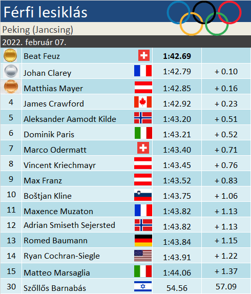Beat Feuz immár mindent megnyert, amit egy lesikló megnyerhetett. A svájcit eddig is már csak a sítörténelem legendáival emlegettük egy lapon, és most az utolsó, még hiányzó cím is tarsolyba került – Beat Feuz a lesiklás olimpiai bajnoka! A svájci a versenyen azt a Mayert előzte a versenyen, aki a pálya tetején maradt el fél másodperccel a legjobbaktól, a középső szakaszon viszont már brillírozott. Pár sízővel később viszont még valaki befért kettejük közé: a 41 éves Johan Clarey. A továbbra is nyeretlen francia immár olimpiai másodiknak is mondhatja magát, mondhatni a maga mindig peches módján koronázta meg egy fehér arannyal pályafutását. Szőllős Barnabás a 30. helyen végzett!