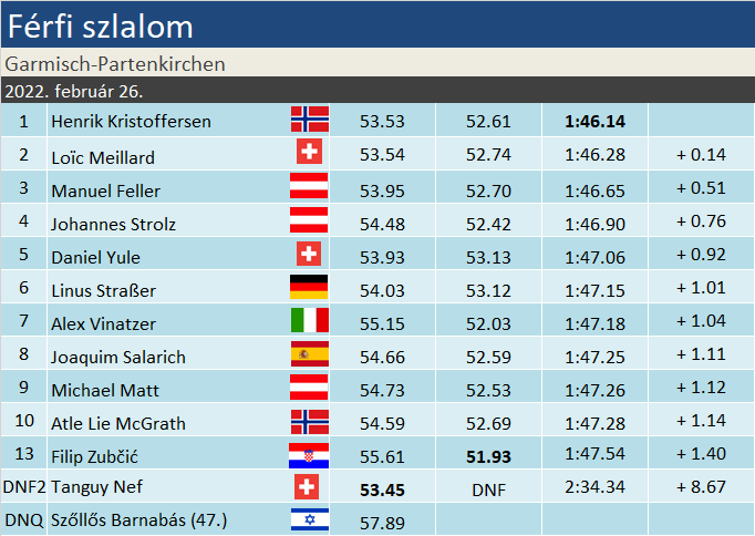 Henrik Kristoffersen egyre inkább kezd visszatalálni régi önmagához. 184. Vk-versenyén 68. dobogóját és 25. győzelmét húzta be. Több mint egy év után sikerült újból győznie szlalomban, vagyis megint újabb győztest köszönthettünk ebben az őrült idényben. Loïc Meillard 123. versenyén 7. pódiumát ünnepelhette, szlalomban 2018 után másodszor sikerült neki ez a bravúr. Manuel Feller talán a legmegszokottabb név a dobogón, 145. versenyén 14. top-3-as helyének örülhetett. Már 3 szlalomdobogója van az idényben, ez egészen elképesztő stabilitásnak tűnik manapság.