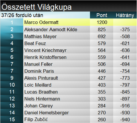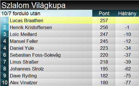 A szakági pontversenyben folytatódik az őrület: Braathen a kiesése ellenére továbbra is vezet 257 ponttal, Kristoffersen egyetlen ponttal áll mögötte. Meillard hátránya 10 pont, Felleré 12. Az első 13 síelő 100 ponton belül van. A szlalomkáosz mellékes következménye, hogy az összetett szempontjából gyakorlatilag tét nélküli ez a versenyszám, Kristoffersen a mai győzelmével is majd 150 pontra van még az összetett harmadik helyén álló Mayertől is.