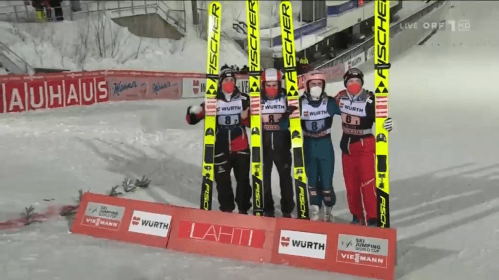 A vége végül hasonló volt, mint az Olimpián: Ausztria hátrányból megfordította az állást Szlovéniával szemben. Stefan Kraft 128 méteres ugrást tudott bemutatni – ezzel egyébként messze ő van a legjobb formában Lahtiban –, míg Peter Prevc (120,5m) kicsit elizgulta a végét. Ezzel Ausztria újabb csapatversenyt nyert meg a szezonban, méghozzá nem is a legerősebb összeállításában!