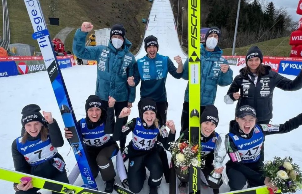 A szlovének ugyanis, kiváltképp Nika Kriznar (88m, 86,5m) és az újdonsült olimpiai bajnok, Ursa Bogataj (95m, 86m) révén, dominálták a versenyt, azonban az első sorozatban Spela Rogeljt kizárták a ruhája nem megfelelőssége miatt. A csapat ennek ellenére is, az ötödik helyen továbbjutott a második sorozatba.