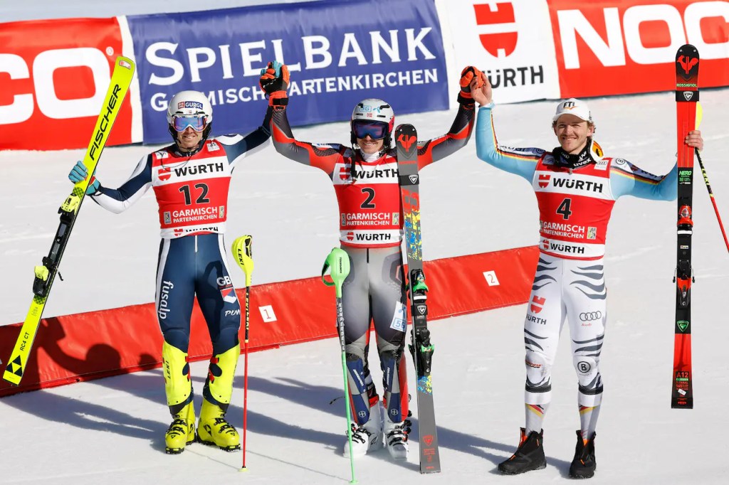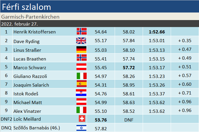Megszakadt egy komoly sorozat, hét különböző győztes után duplázni tudott Garmisch-Partenkirchenben Henrik Kristoffersen, amivel nemhogy átvette a vezetést a szakágiban, de közel félszáz pontos előnnyel rendelkezik két versennyel a vége előtt. A norvég mellett a kiváló második futamot síző Dave Ryding, valamint a hazaiak nagy örömére Linus Straßer állhatott fel a dobogóra. Míg Schwarz idei legjobbjával előrelépett az 5. helyre, a délelőtt még dobogós helyen álló Meillard- Zenhäusern- Strolz hármas egyformán kiesett. Joaquim Salarich tegnapi nyolcadik helyét még egy pozícióval megjavította, jelezve, hogy a fele sem tréfa, s a spanyolok világszínvonalú szlalomossal büszkélkedhetnek.