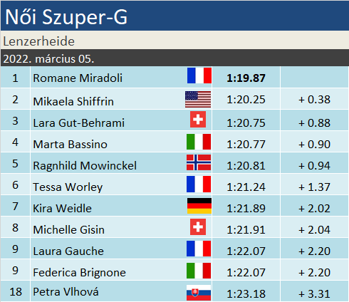 Mikaela Shiffrin nyolcadszor állhatott fel dobogóra szuperóriásban. Váratlan fejlemény ez a súlyos bukásként megélt olimpia után pár héttel, úgy pedig különösen, hogy meglepően komoly előnnyel járt együtt összetettben. Innentől kezdve kell legalább egy extra Vlhovától például a számára idén nem túl kedves óriás-műlesiklásban. Lara Gut-Behrami 29. pódiumát szerezte SG-ben. Egész szezonban fizikális és mentális megpróbáltatásoknak volt kitéve, saját bevallása szerint november óta egyfolytában beteg. Jó hír szurkolóinak, hogy még legalább egy szezont vállalni fog.