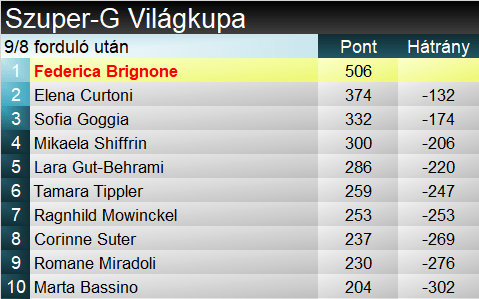 Ester Ledecká (26.) roppant zaklatottan kezdett, s a méretes elfékezések a teljes lejtőn jellemezték a cseh menetét. Ilyenkor szoktuk azt írni, hogy nem érzett rá valaki a pálya ritmusára. Na, ez esetben a „köze se volt hozzá” a valós helyzetértékelés. Worley után valahol várható volt, hogy elemében lesz ma Federica Brignone (9.). Többségében direkt íveken tudta le a pálya nehéz kanyarjait, csakhogy fent egy bukkanó után nagyon mélyről kellett ívre váltania, ami kezdeti előnyét szertefoszlatta. A vége pedig egyszerűen meg sem közelítette a franciától látottakat. Szomorkodásra oka így sem volt, hiszen már Curtoni kiesésének pillanatában megnyerte a szakági pontversenyt.