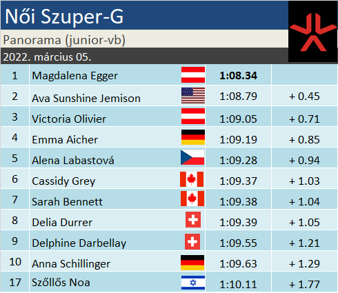 Magdalena Egger a lesiklás után megnyerte a Szuper-G-t is, így már öt junior-vb-címnél tart az osztrákok nagyon nagy ígérete. Nyugati szomszédaink dörzsölhetik markukat, mivel a harmadik helyen a még ifjúsági korú Victoria Olivier végzett. Az ezüstérem az amerikai Ava Sunshine Jemison nyakába került. Aicher 85 százados hátránnyal zárt a negyedik helyen, ami azért fontos, mert a mai futam a holnapi szlalommal együtt képezi a kombinációt, mint külön versenyszámot. Szőllős Noa szépen teljesített, az 52 fős mezőnyben a 17. helyen zárt, 1,77-es hátránnyal.