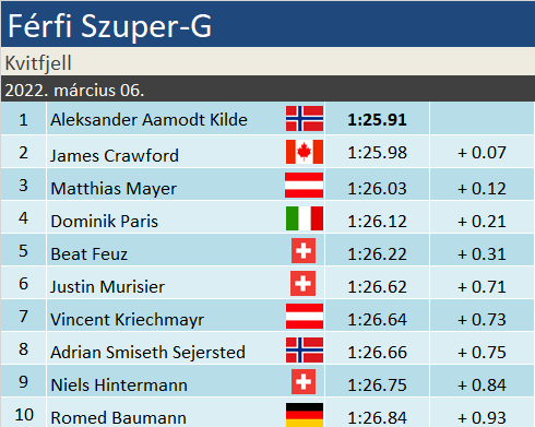 Aleksander Aamodt Kilde 13. alkalommal végzett a dobogó tetején, ráadásul ennek több mint felét, szám szerint hetet az idei szezonban ért el. 7. szuper-G győzelme az első, amit hazai havon szerzett. A norvég az eddigi hét szuperóriásból ötöt megnyert, Wengenben második lett, míg Kanadában kiesett. Ilyen eredménysorral eldőlt, egy versennyel a vége előtt megnyerte a szakági világkupát, 2016-ot követően másodszor. James Crawford a cortinai világbajnokságon robbant be a köztudatba, ahol majdnem érmet szerzett, míg Pekingben idén már ez sem maradt el – kombinációban lett bronzérmes. A kanadaiak ifjú reménysége idén stabilan versenyzett, csak idő kérdése volt, mikor állhat először dobogóra. Családjában ezzel ő a második, aki világkupán a legjobb háromban végzett: nagynénje, Judy Crawford 49 éve Grindelwaldban lett harmadik, műlesiklásban. Matthias Mayer rendkívül stabil formát mutatott egész hétvégén, pénteki lesikló harmadik helye után most szuper-G-ben is ugyanilyen pozícióban végzett. 43. dobogós helyéven a 9. legeredményesebb osztrák VK-síző, lehagyta Mario Mattot és már csak egy dobogós helyre jár Hannes Reichelttől.