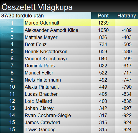Marco Odermatt ma mindössze 3 pontot szerzett, így összetettben az előnye 189 pontra csökkent, hét versennyel a szezon vége előtt. Kilde lemaradása ezzel együtt is jelentős, pláne, ha hozzávesszük, hogy ebből a két műlesikláson egyikőjüktől sem várható rajtolás sem, míg 3 óriást rendeznek, ahol Odermatt egész szezonban szinte verhetetlen volt, míg sérülése óta Kilde el sem indult a számban. Egyébként mai 100 pontjával már a norvég is átlépte az 1000 pontot. Az összetett dobogó várhatóan Mayer, Feuz és hatalmas hajrá esetén Kristoffersen közt dőlhet el.