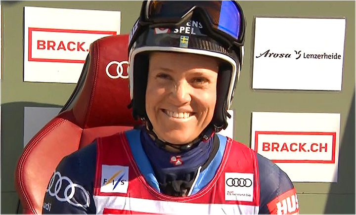 Tökéletes síidő várta a lányokat és a mintegy 10 000 nézőt a hét utolsó napján. A fergeteges hangulathoz pedig kihívásokkal teli lejtő dukált. Pierre Miniotti, Hector edzője állította össze az első futam nyomvonalát. Ritmusos volt a tűzés, természetesen idomult a svéd stílusához, mert muszáj volt támadni a pályát. A kezdés volt kegyetlenül meredek, 60%-os meredekséggel.