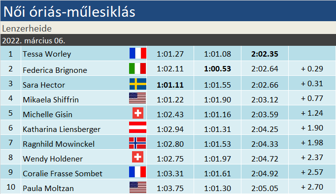 Tessa Worley 55 pontra csökkentette a hátrányát a szakági világkupában Sara Hector mögött, két versennyel a szezon vége előtt. Mikaela Shiffrin hátránya már 111 pont, így számára már a többiek hibája is kellene, hogy esélye maradjon a kristálygömbért küzdeni Méribelben.