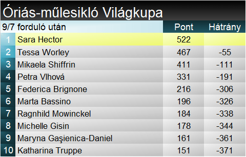 Mikaela Shiffrin (4.) viszont ezzel a nem túl acélos Worley-sízéssel sem tudta felvenni a harcot. Le-lecsúszott a kapuk tövétől, így végül Brignonét sem tudta maga mögött tartani. Ennek ellenére így is jelentősen növelte előnyét az összetettben. Sara Hector (3.) sem volt ezúttal olyan magabiztos, mint azt megszokhattuk a szezonban. A rajtot követően is voltak kisebb megingásai, majd a pálya közepén volt egy nagyobb megbillenése, így a haramdik helyre fért be a szakági éllovas svéd.