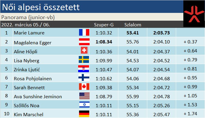 Szőllős Noa a hatodik legjobb szlalomos idővel a 9. helyen végzett alpesi összetettben a junior-világbajnokságon! Az izraeli-magyar olimpikon egy tegnapi rontás után “csak” a 17. helyről várhatta a mai folytatást. Mai nagyszerű sízésével az ifjúsági olimpiai érmei után immáron a juniorok között is megmutatta magát. Az aranyérmet némi meglepetésre a francia Marie Lamure szerezte meg, miután a 23. pozícióból messze a legjobb menettel megelőzte a szlalomot az élrő kezdő Magdalena Eggert. A bronz a svájci Aline Höplinek jutott. Nyberg, Ljutić, Pohjolainen a további sorrend. Emma Aicher kiesett.