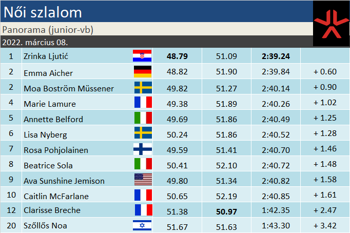 Délutánra érkezett néhány termetesebb felhő, de a látási viszonyok nem romlottak látványosan. Az első mértékadó menetet a vb egyik felfedezettje, Victoria Olivier (21.), de jelentős előrelépéssel ez sem járt a részéről, a pálya masszívan kitartott a végéig. Nagy örömünkre épp Szőllős Noa (20.) váltotta az osztrákot az élen. Noa a kilencedik legerősebb második futam birtokosaként megelőzte a Vk-tapasztalattal bíró Mathiout (25.), illetve két kiesett versenyzőt. Dinamikussága ezúttal nagy hibáktól mentesen érvényesült, a ritmusból egy pillanatig nem esett ki. A TOP20-as helyezés komoly fegyvertény 19 éves fejjel.