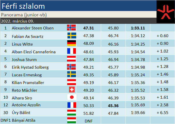 A technikai számokban minden jel szerint adott lesz a dicső norvég szereplés a jövőben is. Alexander Steen Olsen az óriás-műlesiklás után a szlalomot is könnyedén besöpörte. A legrövidebb számban bő egy másodperccel utasította maga mögé a svéd Fabian Ax Swartzot, illetőleg a német Linus Wittét. Az osztrák férfiak megint érem nélkül maradtak, legjobbjuk, Joshua Sturm az 5. helyen végzett. A magyarok közül Úry Bálint elsősorban a második futamban tett ki magáért, akkor alig két és fél másodpercet kapott a győztes norvégtól, ami összességében egy szépnek mondható 30. helyet eredményezett a számára. Bányai Attila kiesett az első futam során.