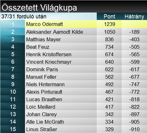 A megszokottakhoz képest kivonatolt beszámoló következik – a hétvégi versenyekre már visszatérünk a szokott formátumra! A német edző által tűzött pályán a szakági éllovas Henrik Kristoffersen (28.) rajtolt elsőként, a pálya végén hatalmasat hibázott. Pályán maradt ugyan, de hogy versenyben is, azért izgulnia kellett. Sebastian Foss-Solevåg (8.) bicskája is majdnem beletört az utolsó letörésbe, de az aktuláis világbajnok hibája kisebb volt. Dave Ryding (5.) a felső szakaszokon nem volt olyan átütő, viszont a végén, hiba nélkül majd’ kilenc tizedet adott Solevågnak, így át tudta venni a vezetést. Manuel Feller (6.) hasonlóan síelt, de felül voltak kisebb késései. Clement Noël (3.) sem tudta überelni a brit 2. szektorát, utána viszont magabiztosabb volt – szűk vezetés lett az eredménye. A folytatásban Meillard (14.) rontott, míg Straßer (12.) a ritmust nem kapta el.