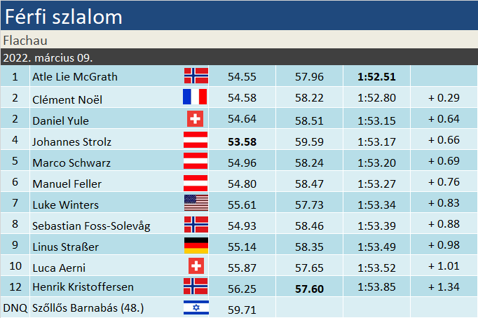 Újabb norvég győzelem született szlalomban, a tegnap esti flachaui villanyfényes versenyen. A szezon kilencedik versenyén ötödször győztek az északiak, de ismét új győztest avattunk – Atle Lie McGrath sikerét hozta a szerda este. Az első futamos vezetés továbbra sem garantál győzelmet, Johannes Strolz egy másodperccel vezetett ugyan féltávnál, gyenge második futama révén viszont a dobogóról is lecsúszott. McGrath mögött Noël és Yule végzett dobogón. A szakági éllovasok nem remekeltek, Kristoffersen és Braathen is pontszegény versenyt zárt, matematikailag továbbra is ötesélyes küzdelemmel érkeznek a szlalomspecialisták a VK-döntőre.