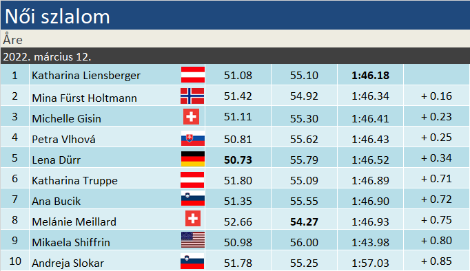 Katharina Liensberger a meglehetősen döcögősen induló címvédő szezonját szépítette ma idei első győzelmével. A szakági címvédő, és egyben világbajnok mindössze harmadszor nyert VK-versenyt. Az elsőt ugyanitt nyerte, egy nap híján egy éve, amivel a kis kristálygömböt eredményező menetelése vette kezdetét. 14. alkalommal állt dobogóra, az osztrák hölgyeknek pedig szezonbeli második győzelmét aratta. Mina Fürst Holtmann már a négy szezon óta tartozik a bővebb élmezőnybe mindkét technikai számban, dobogók tekintetében viszont nem túl eredményes. Karrierje során eddig egyszer, 2019 decemberében, Courchevelben volt szintén második, igaz akkor óriásban. Azaz szlalomban karrierje legjobbját és egyben első dobogós helyét ünnepelhette. Michelle Gisin idán negyedszer végzett a legjobb háromban, lesiklást (és a parallelt) leszámítva mindegyik szakágból szerzett legalább egy dobogót. Szlalomban a lienzi versenyt követően végzett ilyen előkelő helyen.