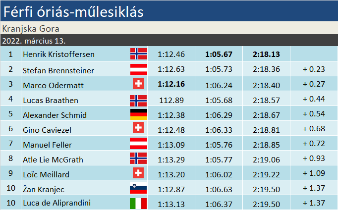 Henrik Kristoffersen idei 5. sikerét aratta, a harmadikat óriásban. Az olimpia óta láthatóan bombaformában síel: Partenkirchen után Kranjska Gorán is duplázni tudott. Összességében 28. győzelmét jegyzi, amivel a férfi örökranglista 12. helyezettje, és lehagyta Mahrét, illetve Höfl-Riescht. Stefan Brennsteiner a szezon végi versenyek nagy mestere, tavaly ugyanitt, illetve Banskón szerezte eddigi dobogóit, két harmadik helyezést. Most ezeket javította meg eggyel, és szerezte meg 3. dobogóját. Marco Odermatt 26-odszor állt fel dobogóra, ennek pontosan fele az idei szezonban történt. Az eddigi 7 óriáson minden alkalommal a legjobb háromban végzett: négyszer győzött, kétszer végzett másodikként Kristoffersen mögött. Mai harmadik helye szezonbeli „legrosszabb” eredménye a szakágban.