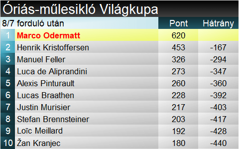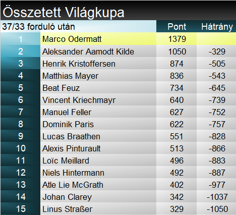 A szakági pontversenyben végül senki nem tudta magát beverekedni a legjobb 25-be a verseny során és az élmezőnyben sem történt változás. Összetettben Marco Odermatt előnye 300 pont fölé nőtt, azaz józan ész szerint megnyerte az összetett világkupát. Kildének ugyanis így már a gyors számok mellett óriásban is győznie kellene, amiben idén rajthoz sem állt, továbbá most már szlalom pontszerzésre is szüksége lenne. Várhatóan a technikai számokban egyébként el sem fog indulni a norvég. Az összetett élén Kristoffersen ugrott fel a harmadik helyre, Mayerrel helyet cserélve.