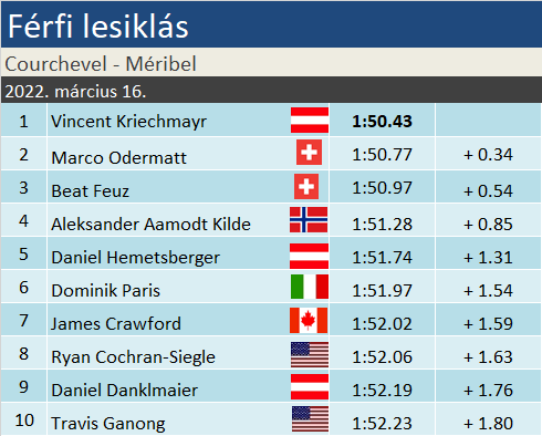 Hiába győzte le Beat Feuz mintegy három tizeddel legnagyobb riválisát, nem sikerült zsinórban ötödik alkalommal elhódítania a lesiklás kristálygömbjét. A harmadik helyen zárt svájci egyetlen pozícióval múlta felül azt az Aleksander Aamodt Kildét, aki – Kjus, Svindal és Jansrud után – negyedik norvégként lett a királyszám szezonbajnoka. Véglegesen eldőlt az Összetett Világkupa sorsa. Marco Odermatt mai második helyével 300 pont fölött tartotta előnyét Kildével szemben, ami három verseny alatt végképp behozhatatlannak számít. A napi győztes a kétszeres világbajnok Vincent Kriechmayr lett.