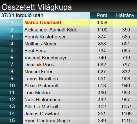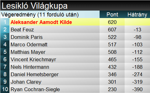 Aleksander Aamodt Kilde megszakította Feuz négy szezonon át tartó sikersorozatát. Azt kell mondanunk, megérdemelten. Három győzelme mellé egy további dobogót nyolc darab TOP8-as helyezést gyűjtött be. A stabilitás szólt mellette, no és az, hogy Feuz nem tudta azt a magabiztosságot hozni, ami az előző években jellemezte. Az olimpiai bajnoki címmel mégsem lehet szomorú szezonja miatt. A szakági pódium harmadik fokára Dominik Paris állhatott fel. Minimális különbséggel előzte meg az Odermatt- Mayer kettőst. Esetében kiemelendő, miként szedte össze magát fokozatosan egy hatalmas bukást követően.