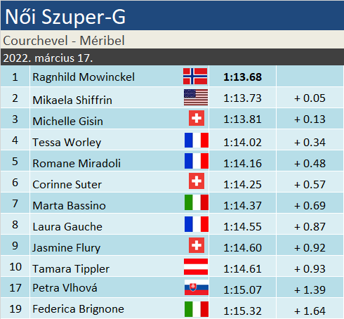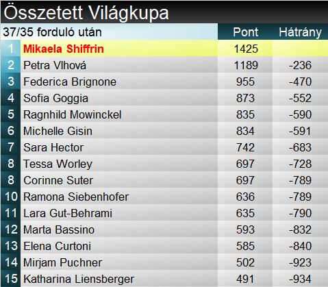 Begyógyulóban az olimpián ejtett sebek, netán Kilde közelsége idézte elő a szezon véghajrájának nem várt izgalommentességét? Akárhogyan is, Mikaela Shiffrin nem várta meg, hogy szombaton szembe nézzen démonjaival szlalomban, a gyors számokban bezsebelt 180 ponttal kérdést nem hagyott a továbbiakra. A mai, egyébiránt tétnélküli Szuper-G-n századok választották el attól, hogy legyőzze Ragnhild Mowinckelt, de mivel Vlhová ismét pont nélkül zárt, mindez nem osztott, nem szorzott. A napi dobogóra még Michelle Gisin fért fel, míg a szakági összevetésben a kristálygömbös Federica Brignone mögött Curtoni és Shiffrin végzett pódiumon.