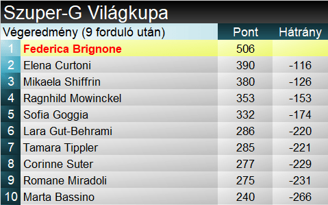 Csak ismételni tudjuk magunkat: miközben kedvenc számában, óriás-műlesiklásban kiesett a ritmusból, Szuper-G-ben új erőre kapott Federica Brignone. A tempós kanyarokat végig uralta a télen, háromszor győzött, ezen felül rendkívüli kiegyensúlyozottságról tett tanúbizonyságot. Az i-re Lenzerheidén tette fel a pontot. Apró szépséghiba, hogy az olimpián nem jött össze érem, legalábbis szuperóriásban. Vitrinjébe két kombinációban és egy óriás-műlesiklásban szerzett trófeája mellé megérkezett a negyedik kis kristálygömb, az összetett sikeréről nem szólva.