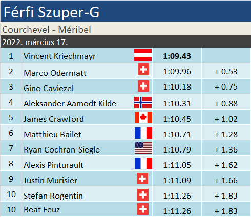 Vincent Kriechmayr a lesiklás után egy nappal a szuper-G-t is meg tudta nyerni a Courchevelben zajló világkupadöntőn. A szakági és összetett elsőség tekintetáben viszonylag tét nélküli verseny dobogója sokban egyezett a tegnapival: ezúttal is Marco Odermatt végzett a második helyen, mögötte egy újabb svájcival, most azonban Feuz helyett Gino Caviezellel. Aleksander Aamodt Kilde idén másodszpr maradt le a dobogóról. Negyedik helyen végzett, a kis kristálygömböt pedig már ettől függetlenül is a magasba emelhette.