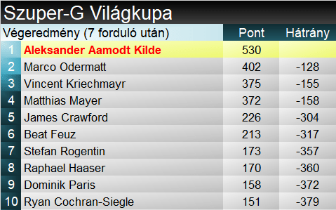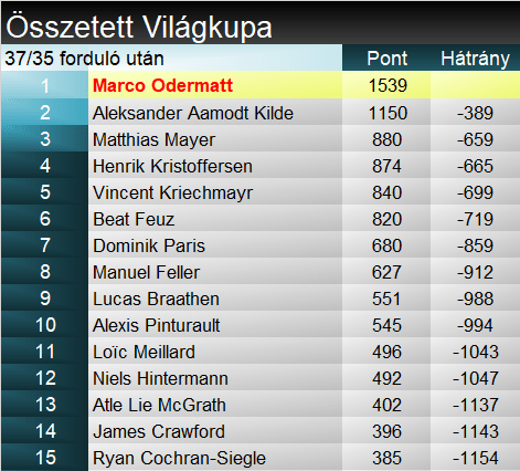 Összetettben Odermatt tegnap már biztosította elsőségét, ma pedig Kilde második helye is biztossá vált matematikailag is, ha valakinek lettek volna még kétsége ezt illetően. Mayer viszont alig bírt ellépni Kristoffersen elől, így a norvég formáját látva szinte biztos, hogy a hétvégi két versenyen visszaelőzi majd az osztrákot.