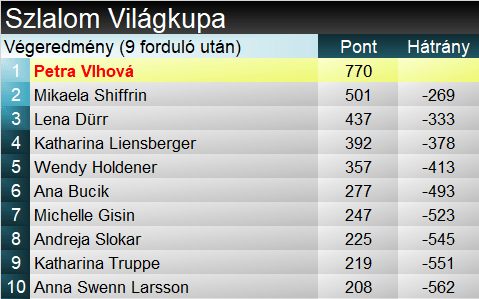 A szakági világkupát Petra Vlhová már januárban, Schladmingban bebiztosította magának. Lényegében uralta a szezont, és a kis kristálygömb mellett az olimpiai aranyérem is az ő nyakába került szlalomban. 2020-ban már magasba emelhette a szakági kristálygömböt, és tavaly is sokáig úgy tűnt, címet védhet, de Liensberger az utolsó pillanatban elhalászta ezt a Shiffrin-Vlhová kettős orra elől. Ezúttal viszont nem akadt komolyabb kihívó sem, így második szakági elsőségét ünnepelhette ma, tavalyról pedig a nagy kristálygömböt is vitrinjében őrizheti. A szakági pontverseny második helyén Mikaela Shiffrin végzett, aki két versenyt tudott megnyerni, és még háromszor végzett Vlhová mögött második helyen. Idén azonban többször is hibázott, valamint koronavírus miatt versenyt is ki kellett hagynia, így hamar elszállt az esélye az első helyre. Lena Dürr egyértelműen az idei harmadik erő volt szlalomban, így megérdemelten került nyakába a szakági bronzérem, minek után mai második helyével visszaelőzte a tabellán Katharina Leinsbergert.