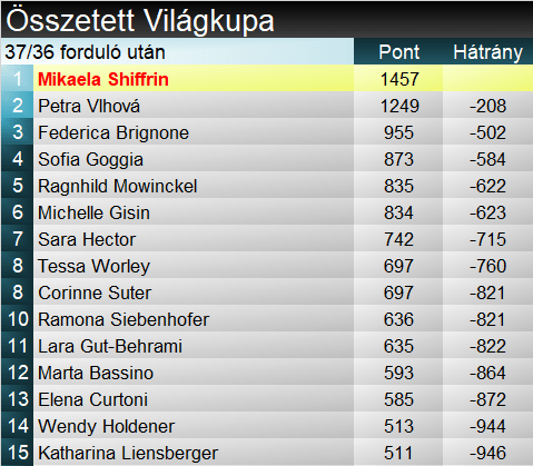 Összetettben Mikaela Shiffrin már tegnapelőtt nyert, és Petra Vlhová második helye is biztos. A harmadik helyre Federica Brignone az esélyes, nem valószínű, hogy Goggia épp óriásban előzi meg honfitársát.
