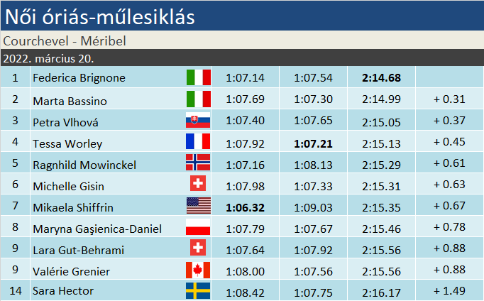 Francia fiesztát hozott a szezon utolsó női versenye. Tessa Worley elszúrta délelőtti futamát, hogy aztán másodjára a délután legjobb időeredményével nyomás alá helyezze a toronymagasan vezető Mikaela Shiffrint. Az amerikai aztán sokadjára megmutatta, miként lehet nyert helyzetből elbukni mindent: a leggyöngébb menettel végül még a franciától is kikapott. A reggel még listavezető olimpiai bajnok, Sara Hector sérülése miatt nem volt megfelelő állapotban, nem volt esélye a kristálygömbre. Ami a napi dobogót illeti, Federica Brignone nyerte a versenyt, megelőzve Bassinót és Vlhovát.