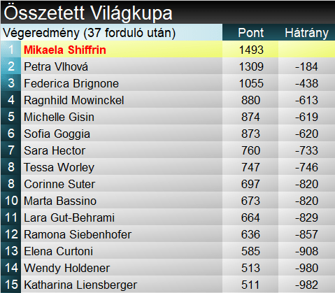 Sara Hector élete szezonját zárta. Olimpiai bajnoki cím, három VK-győzelem, hat VK-pódium. Åréi esésén és sérülésén ment el a szezontrófea, de búslakodásra így sincs oka. Mikaela Shiffrin két győzelemmel, s még egy dobogóval nyitotta a szezont, azóta viszont csak múlt héten zárt a TOP3-ban. Jellemzően a második futamokat szúrta el, végső soron elmondható, hogy nem az óriás-műlesiklással nyerte meg az összetettet. Csak 16 pontot fogott Vlhován.