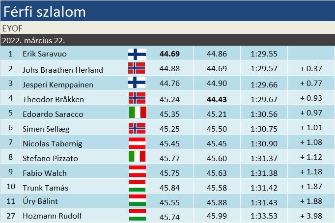 A középmezőnyben nagy volt a szórás az időeredmények tekintetében, így jelentősebb előrelépésre senki nem volt képes. Még a norvég Linberg (13.) sem, pedig nála befigyelt egy topkategóriás menet. Trunk Tamás (10.) olasz ellenfelét hátrébb szorítva került az élre. Néhány századdal, de ez az, amit nem kell magyarázni: magyar síző előzött olaszt. S ezzel még koránt sem volt vége! Kevésen múlt, hogy a 30 FIS-ponttal a korosztályos ranglista negyedik helyén álló Walchot (9.) is megverje. Úgy, hogy Tominak – egyelőre még – ötven fölött van a pontszáma. Ez elvileg jelentős különbség, a gyakorlatban viszont kis híján borult a papírforma. Úry Bálinttal (11.) kard, ki kard csörte zajlott, aki bár ismét nagyon megnyomta futamát, három tizeddel kikapott Tamástól. Összességében pedig egyetlen század döntött Trunk javára. Magyar háziverseny az EFOY bő élmezőnyében – kell ezt tovább magyarázni?