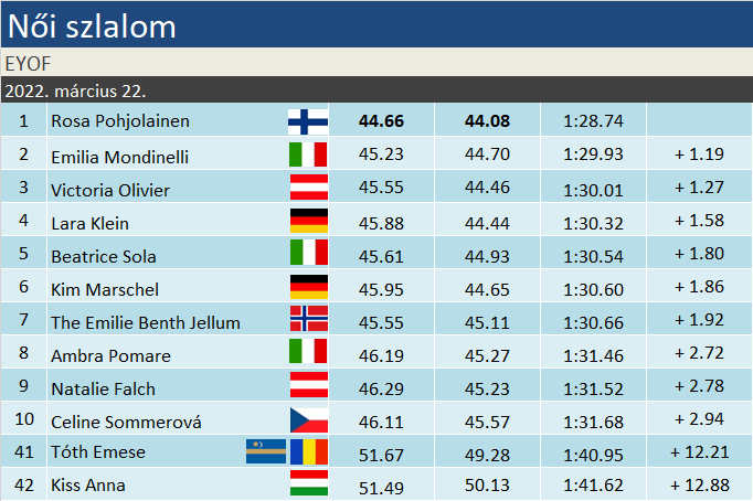 Ez nagy szó volt, mert egyébiránt lassanként a 3 szekundum is elérhetetlenné vált, s ez biztosan a romló pályának is köszönhető volt. Épp ezért örömteli, hogy Kiss Anna (44.) tisztes menettel, kb. 7 másodperc hátránnyal leért. Akárcsak a román színeket képviselő székely lány, Tóth Emese (45.). A mezőny egyébként 70 főt számlált, Anna a 43-as, míg Emese a 48-as rajtszámmal startolt.