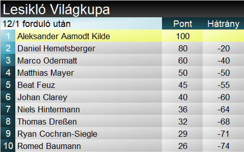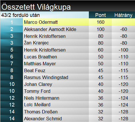 A szakági világkupa természetesen megegyezik a mai sorrenddel, ez legközelebb a jövő héten, Beaver Creekben változhat majd. Az összetettet a söldeni győztes, ma harmadik Odermatt vezeti, 60 ponttal a mai győztes Kilde mögött.