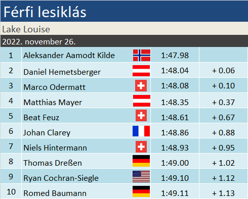 Nagy nehezen, de elrajtolt az idei első lesiklás a férfi Alpesi Sí Világkupában, ahol Lake Louise magát nem meghazudtolva ismét a századok versenyét hozta. A szakági címvédő Aleksander Aamodt Kilde parádés alsó szakasszal utasította maga mögé a többi dobogóst. Annak ellenére, hogy mind Daniel Hemetsberger, mind az összetett címvédő Marco Odermatt komoly előny birtokában fordult a pálya záró harmadára. A verseny egyébként erős svájci csapatteljesítményt hozott, de az igazi szenzációt a közel két év után visszatérő Thomas Dreßen 8. helye jelentette!