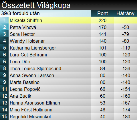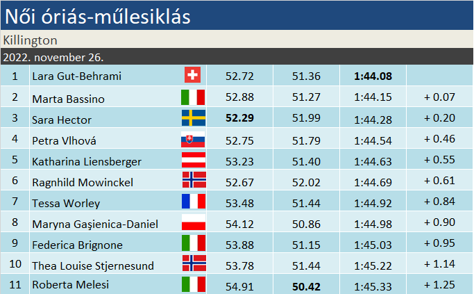 Tizenöt sízőt követően tehát Hector vezette a versenyt, őt néven követték a kb. 5 tizedes tartományon belül. Katharina Liensberger (6.) kellő vehemenciával síelt, s noha megdobta egy hullám, hatodikként befért másodpercen belülre. Míg a szöszke osztrák feljövőben van, Wendy Holdener (15.) már Leviben igazolta remek formáját. Ma elsőre erős kezdés után sok volt a térvesztés, kicsúszott a TOP10-ből. Maria Therese Tviberg nullázott Lappföldön, s ennek elkerülése érdekében lagymatag, óvatos, direkt sízést nyújtott. Jó 1 s-mal maradt el az utolsóelőttitől. Ricarda Haaser (8.) precízen, kulturáltan síelt. Mást ne írjunk, épp befért Worley és Shiffrin közé. Egy hónapja még a titkos favoritokat keresgéltük a szlovén óriás-műlesiklók közt, aztán jöttek a sérülések és Hrovat váratlan visszavonulása. Ana Bucik (9.) maradt hírmondónak, s miként Leviben, úgy ma sem maradt adós a jó menettel. A hazaiak sztárját például még egy hellyel hátrébb sorolta. Paula Moltzan (16.), majd Camille Rast (29.) nem váltották meg a világot.