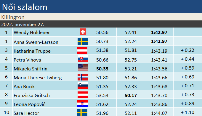 Hatalmas szenzációval ért véget pár a killingtoni műlesiklás: nem elég, hogy holtverseny alakult kiaz első helyen, egyszerre két új győztest avathattunk! A második futamban Anna Swenn-Larsson az ötödik, míg Wendy Holdener a második helyről tudott győzni. Holdener ezzel véget vetett 30 dobogó óta tartó nyeretlenségi szériájának! Az első futamot nyerő Shiffrin nem tudta megszerezni hatodik killingotni győzelmét, a dobogóról is lecsúszott. A harmadik helyet, és ezzel az idei első osztrák dobogót, Katharina Truppe szerezte meg.