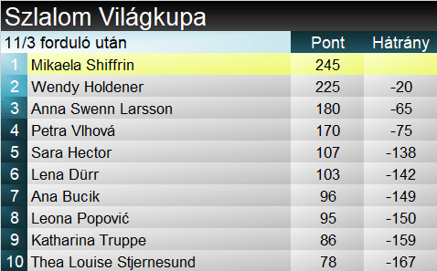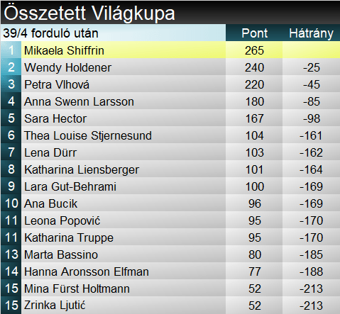 A szakági világkupát továbbra is a Leviben duplázó Shiffrin vezeti, de Holdener jelentősen zárkózott, míg az idei két dobogónál és egy kiesésénél járó Swenn-Larsson felugrott a harmadik helyre. Az összetett első két helyén hasonló a helyzet, viszont a harmadik helyet itt nem Swenn-Larsson, hanem Vlhová foglalja el.