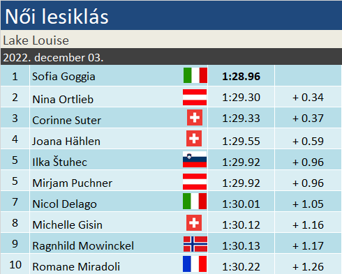 Sofia Goggia megnyerte a második lesiklást is Lake Louise-ban. Az olasz ezúttal nagyobb előnnyel nyert, de a dobogós helyezések további sorrendjében így is csak századok döntöttek a második helyezett Nina Ortlieb és a harmadik Corinne Suter közt. Remek napot zárt Štuhec és Hählen is, a tegnapi harmadik Cornelia Hütter viszont migrén miatt ma nem állt rajthoz.