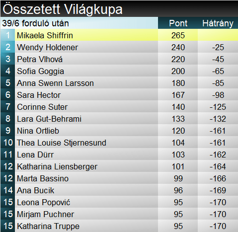 A szakági pontversenyt Goggia magabiztosan vezeti két győzelmével. Száz ponton belül is csak Suter és Ortlieb vannak hozzá képest. Az összetett élén nem történt változás, Sofia Goggia viszont 200 ponttal már lőtávolon belülre ért Mikaela Shiffrinhez képest. Holnap már egy második hellyel is átvenné a vezetést az összetettben az olasz.